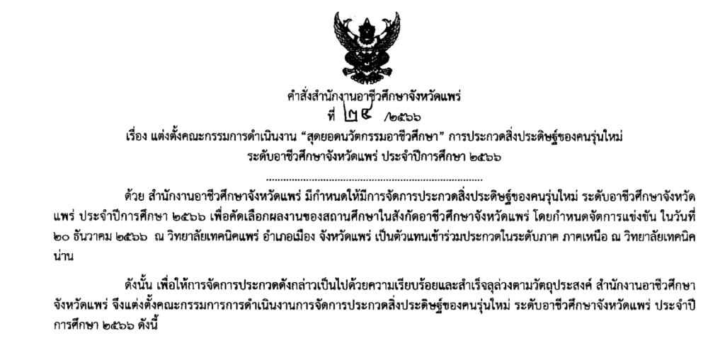 แต่งตั้งคณะกรรมการดำเนินงาน “สุดยอดนวัตกรรมอาชีวศึกษา” การประกวดสิ่งประดิษฐ์ของคนรุ่นใหม่ ระดับอาชีวศึกษาจังหวัดแพร่ ประจำปีการศึกษา 2566